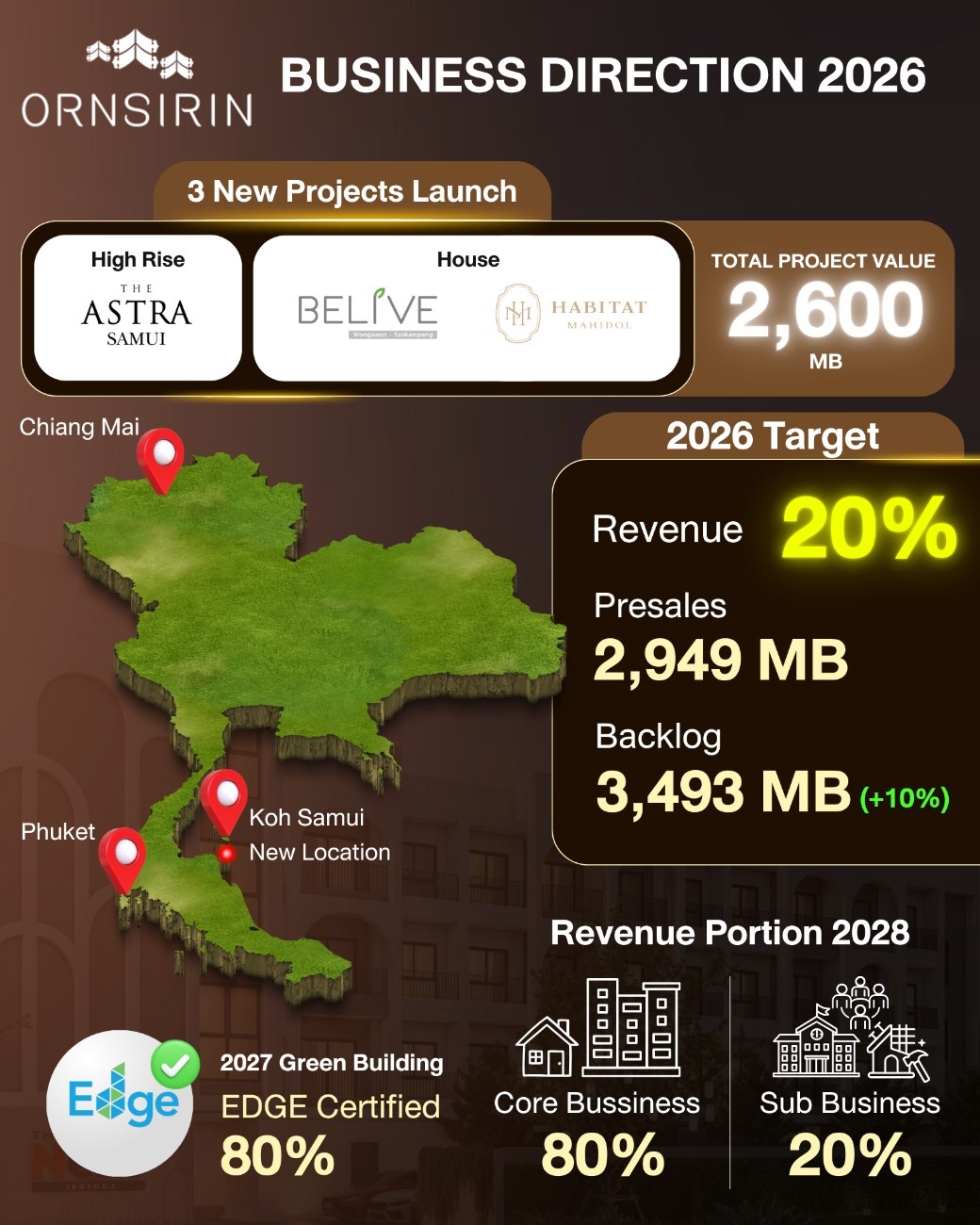 ORN กางแผนธุรกิจปี 2569 เปิด 3 โครงการใหม่มูลค่ารวม 2,600 ล้านบาท รุกตลาด Blue Ocean "สมุย" ชูโครงการคุณภาพมาตรฐาน EDGE Green Building Certified เจาะกลุ่มเรียลดีมานด์ ต่างชาติ นักลงทุน มั่นใจกวาดยอดขายรวมไม่ต่ำกว่า 2,949 ล้านบาท ลุยขยายพอร์ต Recurring Income โรงเรียนนานาชาติ คอมมูนิตี้มอลล์ ทรัพย์มือสอง บริหารต้นทุนรัดกุม คาดรายรวมปี 69 โต 20% ตั้งเป้าสัดส่วนรายได้ธุรกิจหลั