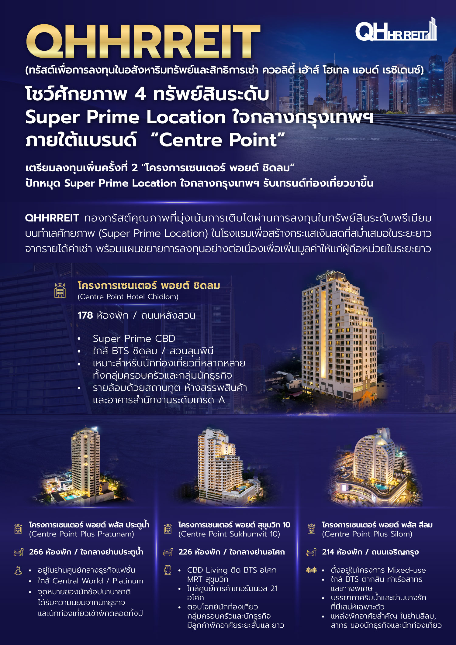 ทรัสต์เพื่อการลงทุนในอสังหาริมทรัพย์และสิทธิการเช่า ควอลิตี้ เฮ้าส์ โฮเทล แอนด์ เรซิเดนซ์ หรือ QHHRREIT (กองทรัสต์ฯ) ตอกย้ำ Hospitality REIT ชั้นนำของไทย โชว์ศักยภาพทรัพย์สินระดับท็อป 4 โครงการภายใต้แบรนด์ “Centre Point” บน Super Prime Location ทั้งประตูน้ำ สุขุมวิท สีลม และชิดลม เตรียมเดินหน้าลงทุนเพิ่มเติมครั้งที่ 2 หลังสำนักงาน ก.ล.ต. นับหนึ่งไฟลิ่ง เพื่อเข้าลงทุนในสิทธิการเช่าอาคาร “โครงการเซนเตอร์ พอยต์ ชิดลม” โรงแรมระดับพรีเมียม บนถนนหลังสวน ทำเลที่เป็น Super Prime CBD ตอบโจทย์ไลฟ์สไตล์และจุดประสงค์การเดินทางที่หลากหลาย ทั้งท่องเที่ยวพักผ่อนหรือประชุมทางธุรกิจของผู้รับบริการหลากหลายสัญชาติ รองรับการเดินทางทั้งระยะสั้นและระยะยาว รับอานิสงส์การท่องเที่ยวฟื้นตัว