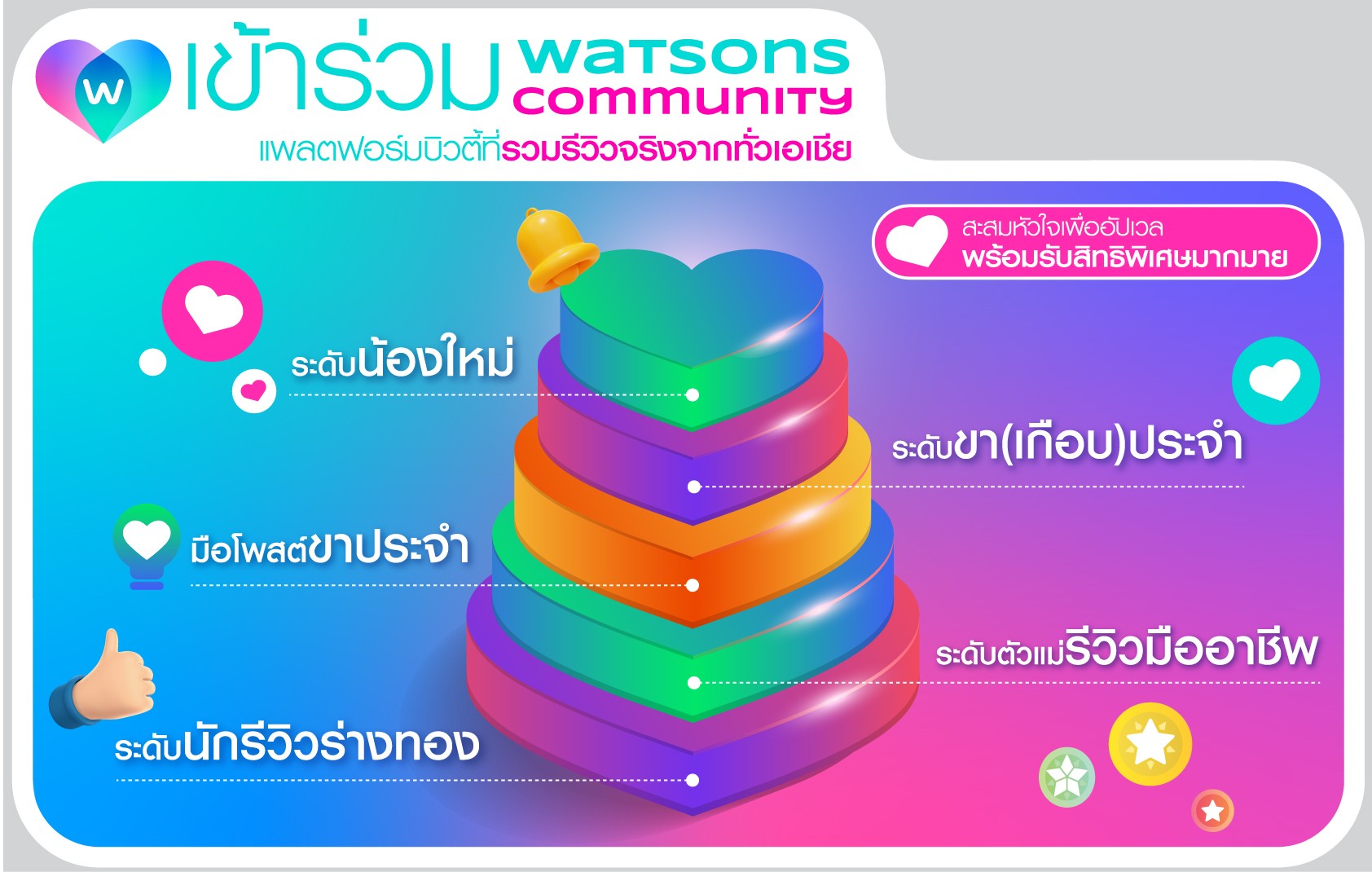 - ร่วมแบ่งปัน Watsons Community มันคือ พื้นที่สร้างสรรค์สำหรับทุกคน เริ่มต้นสร้างโปรไฟล์ของคุณ เพื่อรีวิวสินค้าที่ชื่นชอบ ถามข้อสงสัยเกี่ยวกับบิวตี้ไอเทม หรือแชร์ทริคการดูแลตัวเอง พร้อมสะสมคะแนนและเลื่อนระดับสู่การเป็นที่สุดของนักรีวิวร่างทอง เพื่อแลกรับของรางวัลมากมาย อาทิ สกินแคร์ & บิวตี้ไอเท็มมากมายจากแบรนด์ชั้นนำ